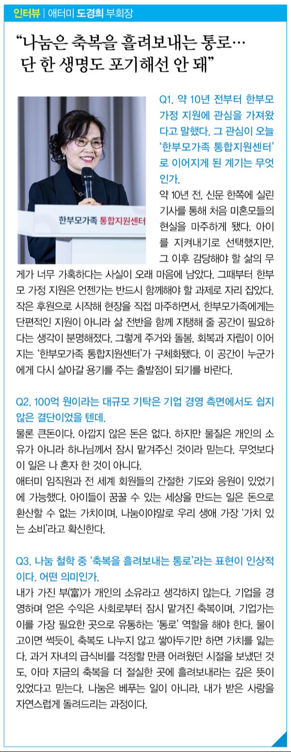 개소식에 참석한 도경희 애터미 부회장은 “한부모가족 통합지원센터는 벼랑 끝에 선 한 생명을 품는 공간이자 누군가에게는 다시 살아갈 용기를 주는 희망의 터전”이라며 “세상에서 가장 고귀한 ‘생명’을 선택했음에도 불구하고 선택 이후 마주하는 현실의 부담이 결코 가볍지 않은 만큼, 이 센터가 잠시 숨을 고르고 삶을 정비할 수 있는 곳이 되길 바란다”고 말했다.