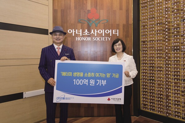 2019년 한부모 가정 지원을 위해 100억 원을 기부한 애터미 박한길 회장(좌측)과 도경희 부회장(우측)