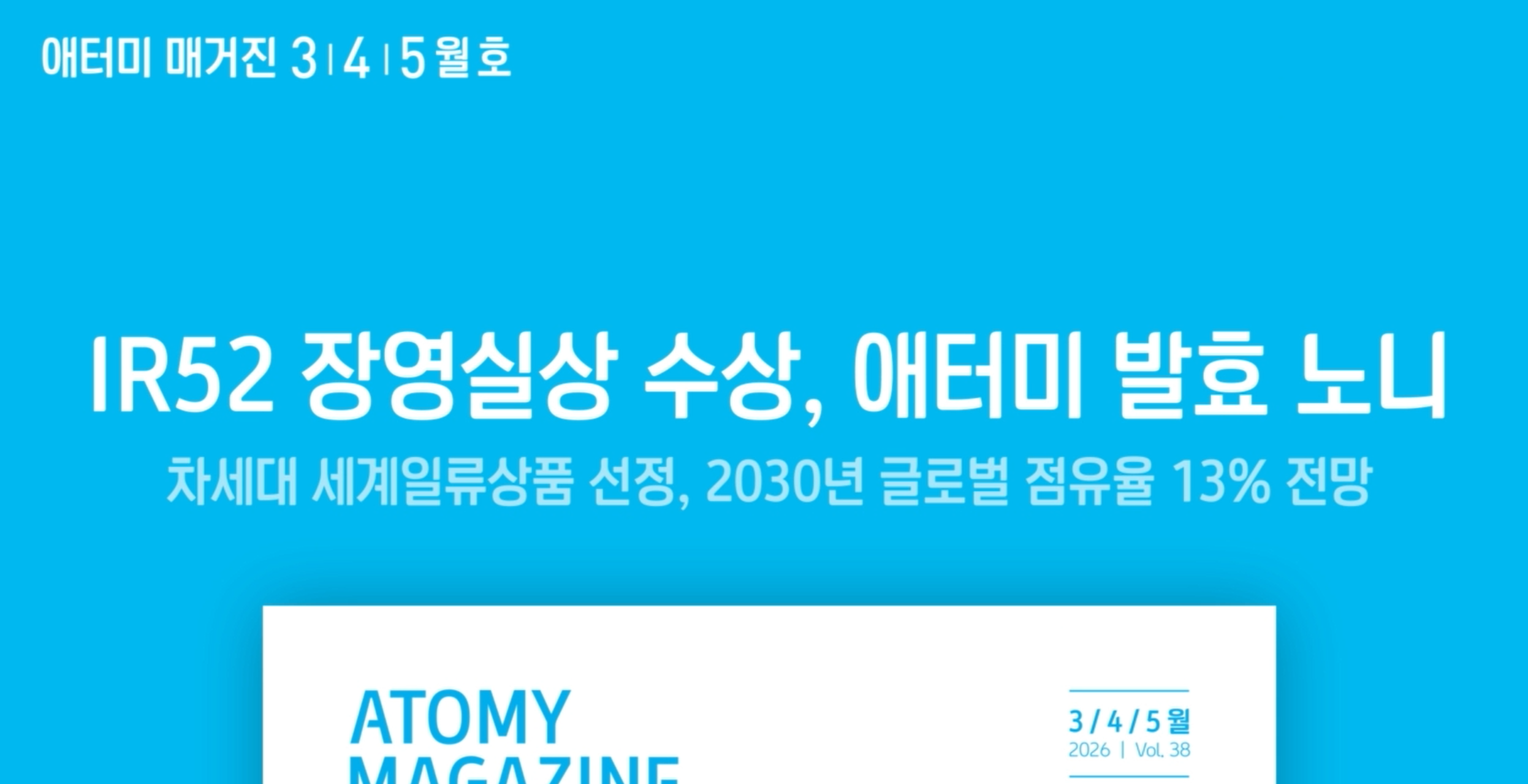 2026년 애터미 매거진 3/4/5월 호 출간 ✔️ 발효로 재탄생한 노니, 연 매출 1,000억 시대를 열다 ✔️ 스킨케어 시스템 더페임 리뉴얼 출시 ✔️ 포스트바이오틱스 코어밸런스 5000 신제품 출시 ✔️ 건기식 시장 현황 및 소비자 실태조사 ✔️ 대한민국 GPTW 2위 선정 ✔️ 박지연 크라운마스터 인터뷰