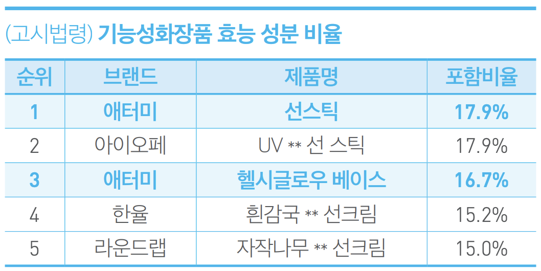 자외선 차단제는 피부에 가장 오랜 시간 닿는 제품 중 하나다. 최근 소비자들은 단순히 어떤 성분이 들어있는지보다, 그 성분이 피부에 어떤 영향을 주는지에 주목한다.분석 결과, 애터미의 주요 선케어 라인은 정부 고시 기준에 따라 ‘기능성화장품 효능 성분’ 포함 비율이 업계 최상위권(1위·3위)으로 나타났다.이는 애터미 선케어 제품이 국가가 공인한 기능성 성분을 충실히 적용하고 있음을 보여준다.