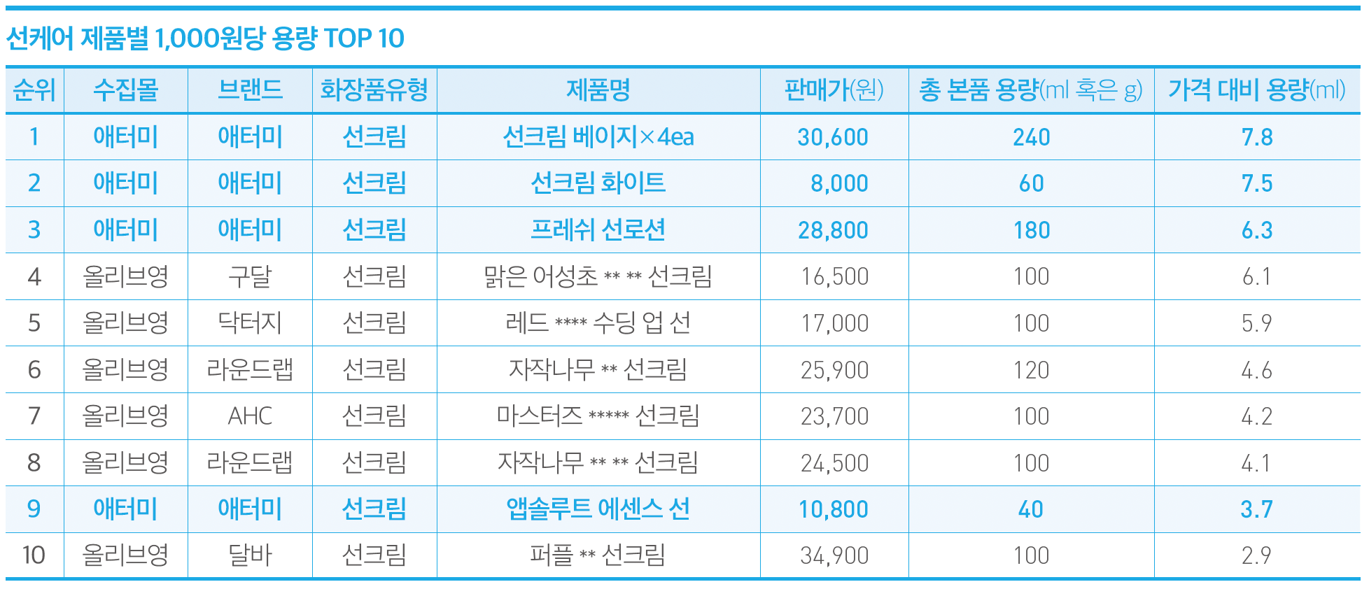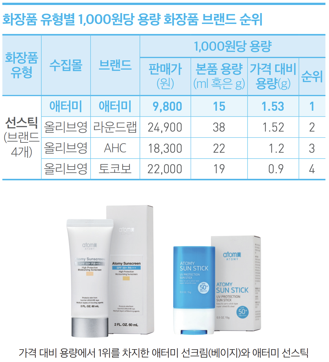 애터미의 가성비 우위는 단순히 전체 제품 순위에만 국한되지 않는다. 화장품 유형별 분석에서도 애터미는 선스틱과 선크림 카테고리에서 각각 1,000원당 용량 1위를 차지했다.