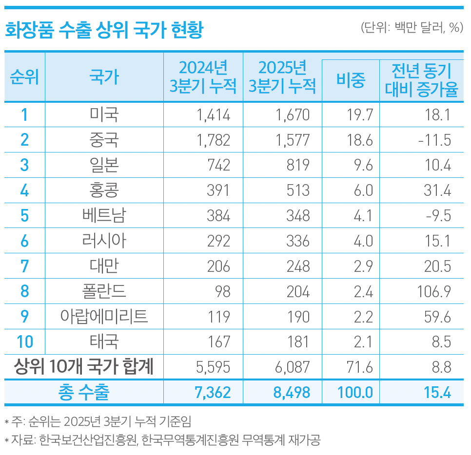 세계를 강타한 K-뷰티의 수출 중심축이 중국에서 미국과 일본 등으로 이동하고 있는 점도 주목된다. 국내 화장품 업계의 최대 시장이었던 중국 수출 비중이 급감하는 대신 미국과 일본, 동남아 등으로 다변화하며 K-뷰티의 세계 시장 진출이 가속화되고 있다.