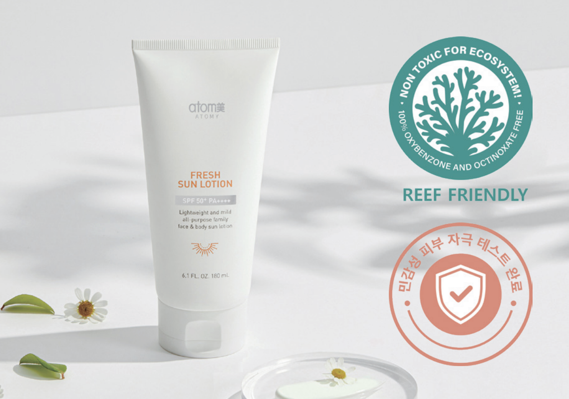 애터미 프레쉬 선로션은 민감성 피부 자극 테스트에서 0.00 무자극 판정을 받아 온 가족이 안심하고 사용할 수 있는 데일리 선크림으로, 해양 생태계에 유해한 성분을 철저히 배제한 리프 프렌들리(Reef Friendly) 인증으로 건강한 피부와 아름다운 환경을 모두 생각하는 애터미의 대표적인 친환경 제품이다