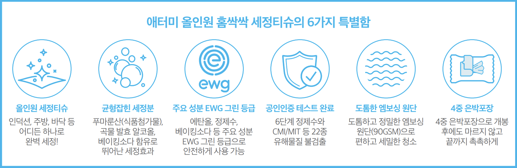 생활 공간을 닦는 세정티슈는 손과 호흡기 그리고 어린 아이의 생활 영역에도 직접 닿기 때문에 성분의 안전성이 무엇보다 중요하다. <애터미 올인원 홈싹싹 세정티슈>는 공인 기관 테스트를 통해 유해 물질 불검출과 EWG 그린 등급에 해당하는 주요 성분들을 사용해 안전성을 더욱 강화했다.