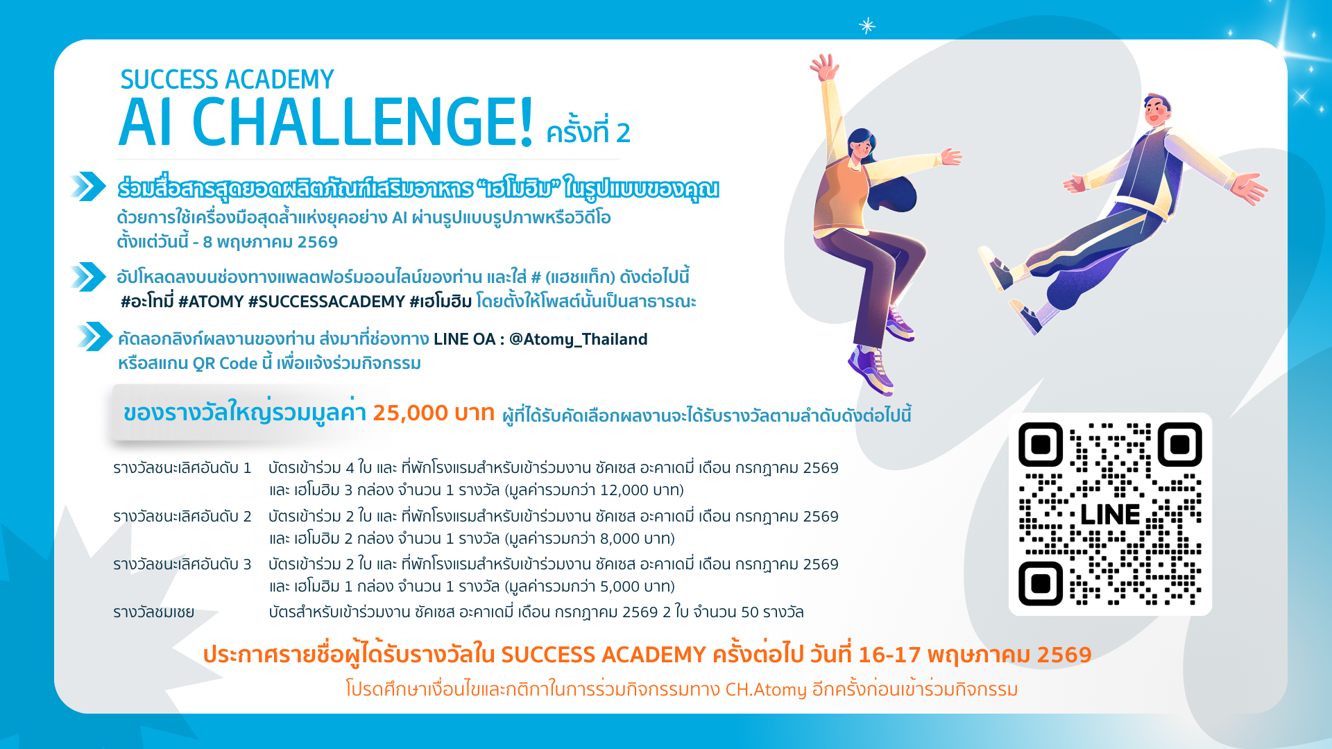 - ของรางวัลข้างต้น (บัตรเข้าร่วมงานและที่พัก) สำหรับใช้งานในงานซัคเซส อะคาเดมี่ เดือนกรกฏาคม 2569 เท่านั้น ไม่สามารถเปลี่ยนแปลงวันเข้าร่วมงานอื่นได้ นอกเหนือจากเงื่อนไขนี้ บริษัทขอสงวนสิทธิ์การมอบรางวัล